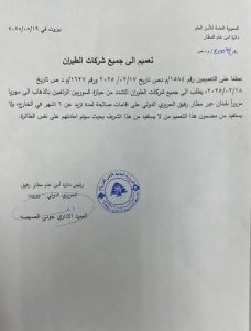 ونص التعميم، الصادرة عن دائرة أمن المطار والموجّه إلى جميع شركات الطيران على “التشدد من حيازة السوريين الراغبين بالذهاب إلى سوريا مروراً بلبنان عبر مطار رفيق الحريري الدولي على إقامات صالحة لمدة تزيد عن 6 أشهر في الخارج”.