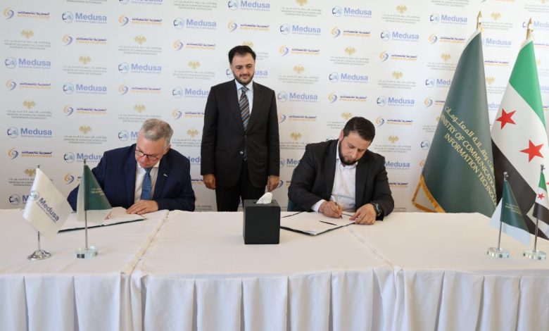 وتم توقيع الاتفاقية في محافظة طرطوس بحضور وزير الاتصالات وتقانة المعلومات عبد السلام هيكل وممثل شركة ميدوسا الإسبانية نورمان البي إلى جانب مسؤولين من محافظتي اللاذقية وطرطوس. وفق وكالة سانا.